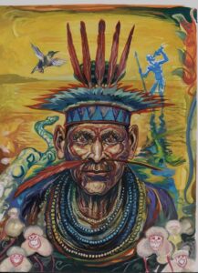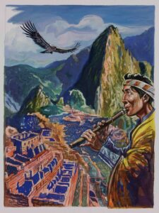 Simon a pris le temps de faire des études de couleurs pour identifier celles qui provoqueraient, les unes par rapport aux autres, une meilleure perception de cette apparence optique tridimensionnelle. Ça lui a permis de brillamment mettre à l’avant-scène les éléments clés de ses illustrations. Il a créé une réalité augmentée qui nous transmet, en une seule image par récit, une synthèse de chacune des expériences vécues par Ugo. Les illustrations ont un fort impact visuel et mental. Elles sont riches en couleurs vives contrastantes, mais en aucune façon opposées. Des images qui racontent que toutes les cultures ont leurs particularités, mais qu’elles peuvent se côtoyer dans l’harmonie.